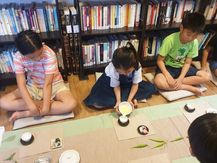 서울 종로구 가회동이 최근 북촌책방(종로구 북촌로5길 19-12)에서 지역내 16명의 초등학생을 대상으로 다도를 통한 예절을 배우고 차와 떡을 나눠 먹는 ‘재미있는 예절교육, 어린이 다례교실’ 프로그램을 진행했다. 사진은 다례교실에서 다도를 하고 있는 아이들의 모습. (사진제공=종로구청)