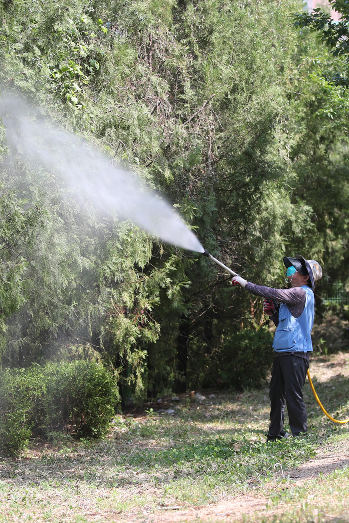 9일 오전 서울 성동구 마장 테니스장 인근 공원에서 성동구 보건소 관계자들이 모기 방역 작업을 하고 있다.