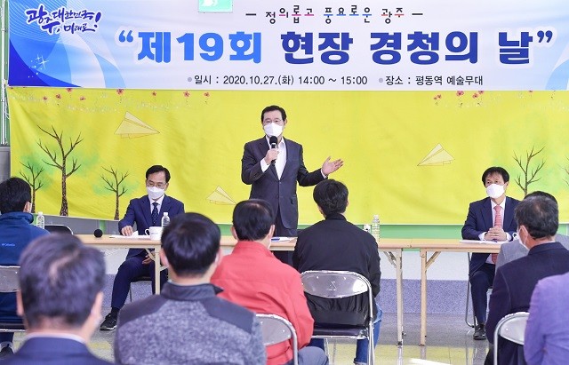 | ▲ 이용섭 광주광역시장이 27일 오후 광산구 평동역 1층 예술무대에서 열린 제19회 현장 경청의 날 행사에 참석해 평동산단 생활형 자전거도로 조성을 위한 민원사항을 청취하며 의견을 나누고 있다./광주광역시 제공 |