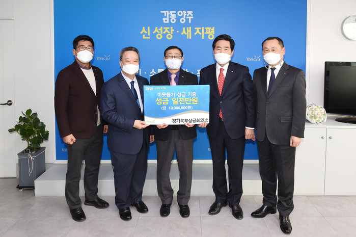 경기북부상공회의소가 15일 경기 양주시청을 방문해 지역내 불우이웃을 돕는 데 써달라며 성금 1000만원을 전달했다. 이날 전달식에는 조학수 양주부시장(가운데), 최상곤 경기북부상공회의소 회장과 위원 등이 참석했다. 사진은 관계자들이 기념촬영을 하는 모습. (사진제공=양주시청)