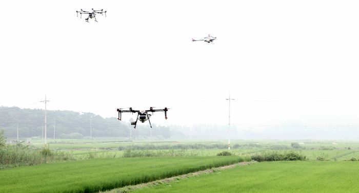 27일 경북 경주시 남산동 통일전 앞 논에서 경주시가 무인헬기와 드론, 광역방제기를 투입해 병해충 방제를 시연하고 있다.