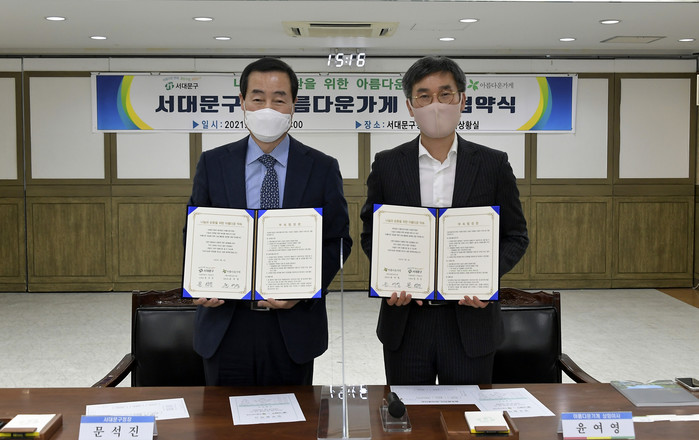 서대문구가 최근 비영리공익재단인 아름다운가게와 업무협약을 맺고 ‘아자아자 캠페인’(아름다운 자원봉사, 아파트 자원순환)을 통해 자원순환과 나눔 활동을 협력하기로 했다. 사진은 협약식에서 문석진 구청장(왼쪽)과 윤여영 상임이사가 기념촬영을 하는 모습. (사진제공=서대문구청)