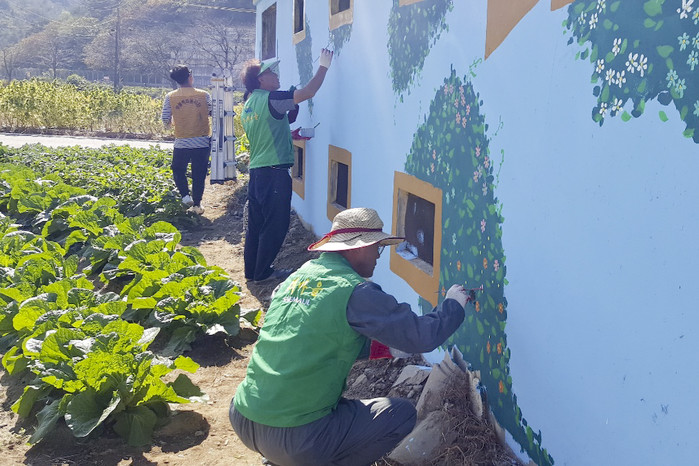 이날 참여한 용주면 새마을 지도자는 벽화봉사단의 지도 아래 마을 입구 150m 가량의 벽면을 아름다운 꽃 그림으로 단장했다.