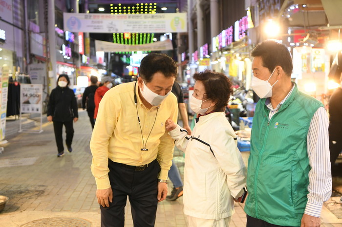 경기 구리시가 최근 구리전통시장 상인회 회의실에서 '삼삼한 구리 톡' 토크 콘서트를 개최했다. 이날 안승남 시장은 전통시장을 찾아 코로나19로 영업에 어려움을 겪는 시장 상인들의 애로사항을 청취하고, 시 상권활성화재단을 통한 경쟁력 있는 특화상권 구축 방안 등을 함께 논의했다. 사진은 안 시장(왼쪽)이 시장을 둘러보며 상인들과 이야기를 나누는 모습. (사진제공=구리시청)