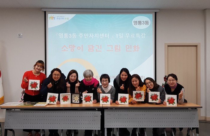 경기 수원시 영통구 영통3동은 지난 2일 민화에 관심이 있는 주민 20명을 대상으로 일일 무료특강 '소망이 가득 담긴 그림, 민화' 수업을 진행했다. 사진은 참여자들이 기념촬영을 하는 모습. (사진제공=영통구청)