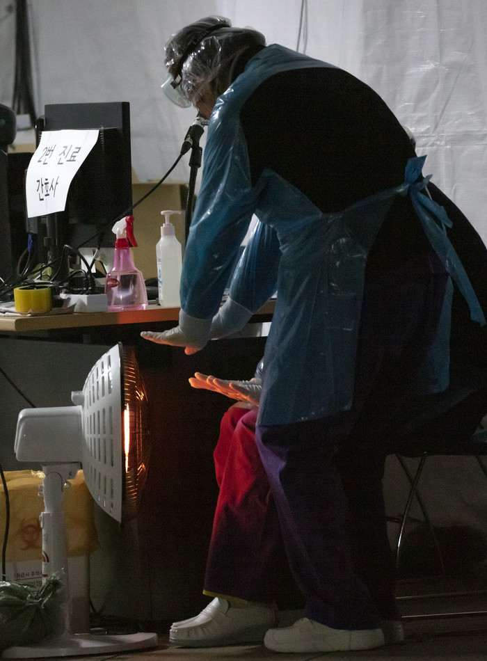 4일 오후 서울 중랑구 서울의료원에 설치된 선별진료소에서 의료진이 전기난로에 손을 녹이고 있다.