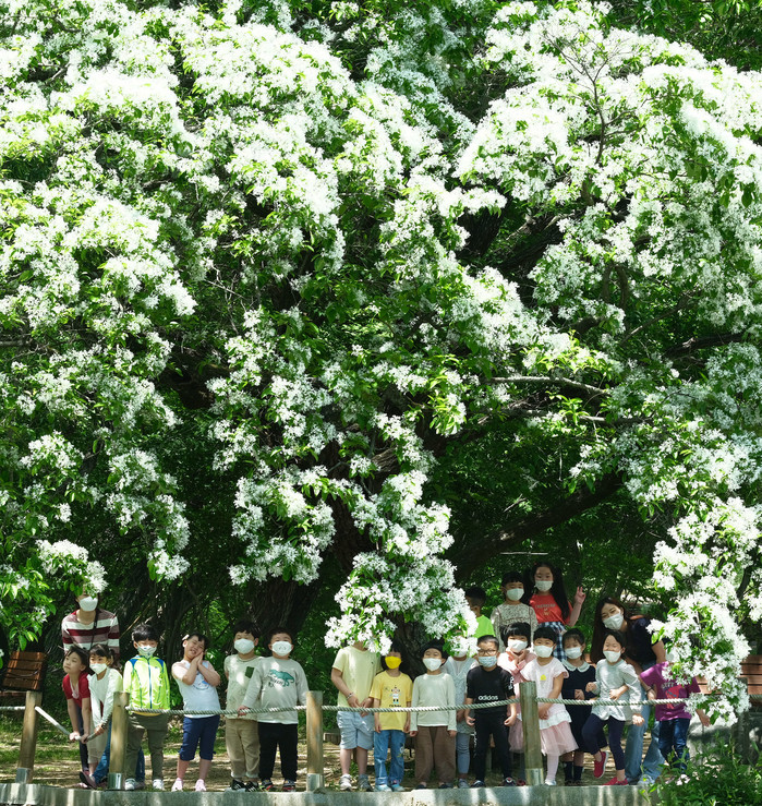 11일 경남 함양군 함양읍 천년의 숲 상림공원을 찾은 어린이들이 쌀밥 같은 하얀 이팝나무꽃 아래서 즐거운 시간을 보내고 있다.