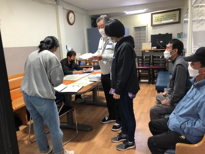 경기 안산시 단원구가 지난 12~13일 지역내 직업소개사업소 100곳을 대상으로 고용계약 알선시 구직자의 코로나19 검사결과 및 예방접종 여부 확인 등 방역수칙 이행실태를 점검하고 코로나19 진단검사와 백신접종 홍보 활동을 전개했다. 사진은 건설일용인부 직업소개사업소에서 점검을 하고 있는 모습. (사진제공=안산시청)