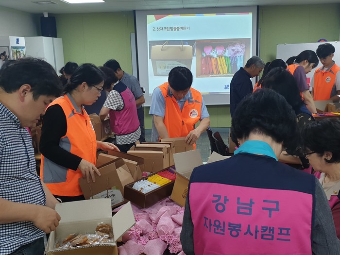 서울 강남구와 한국전력공사 강남지사, GKL, 기아자동차 등 기업 임직원 봉사단과 강남구 자원봉사캠프 활동가들이 함께, 추석명절을 맞아 이달 말까지 소외계층에 간식꾸러미를 전달하는 ‘한가위 달콤상자 나눔’ 봉사활동을 진행한다. 사진은 강남구자원봉사센터 교육장에서 달콤상자를 포장하고 있는 자원봉사자들의 모습. (사진제공=강남구청)