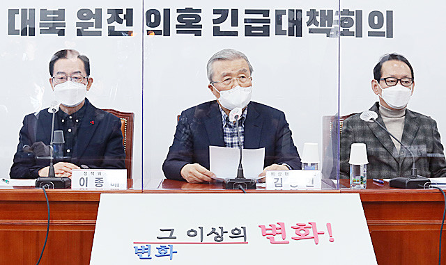 국민의힘 김종인 비상대책위원장이 31일 오후 국회에서 열린 대북 원전 의혹 긴급 대책회의에 참석, 정부가 진상을 밝히지 않으면 국회 차원의 조치가 필요하다고 밝히고 있다.