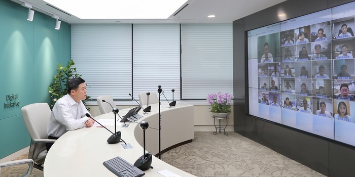 ▲ 우리은행은 지난 13일 정보보호의 날을 맞아 ‘사이버 공격 및 개인정보 유출 대응 모의훈련’을 비대면으로 실시했다. 사진은 권광석 은행장이 주요 임원 및 부서장이 참여한 모의훈련을 주관하고 있는 모습. (사진제공=우리은행) |