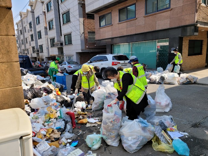경기 수원시 권선구 곡선동은 최근 통장 및 주민 10여명이 자발적으로 모여 곡반정동 상습 무단투기 지역에 쌓인 쓰레기를 올바르게 분리 배출하는 작업에 나섰다. 사진은 참여자들이 쓰레기를 수거하고 있는 모습. (사진제공=권선구청)