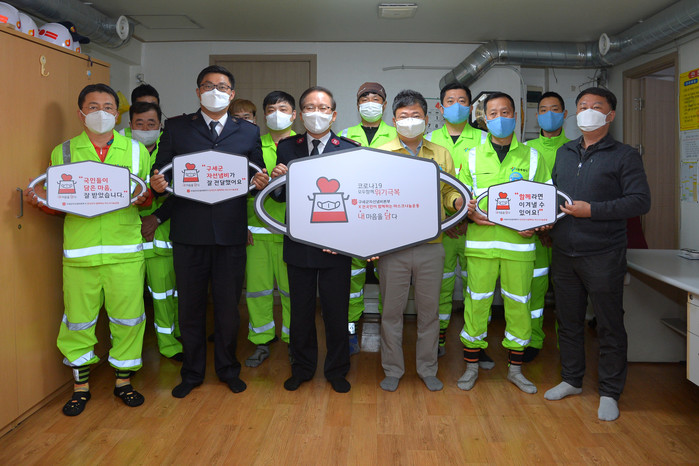 7일 서양호 서울 중구청장(앞줄 왼쪽에서 네 번째)과 곽창희 구세군자선냄비본부 사무총장(앞줄 왼쪽에서 세 번째)이 충무로4가 진양상가에 위치한 환경미화원 휴게실을 방문해 노고를 격려하고 보건용 마스크를 전달했다. 구세군측은 시민들이 기부한 마스크를 사회서비스 종사자에게 전달하고 있으며, 이 중 1400장을 중구 환경미화원에게 전달했다. 사진은 서 구청장 및 관계자들이 기념촬영을 하는 모습. (사진제공=중구청)