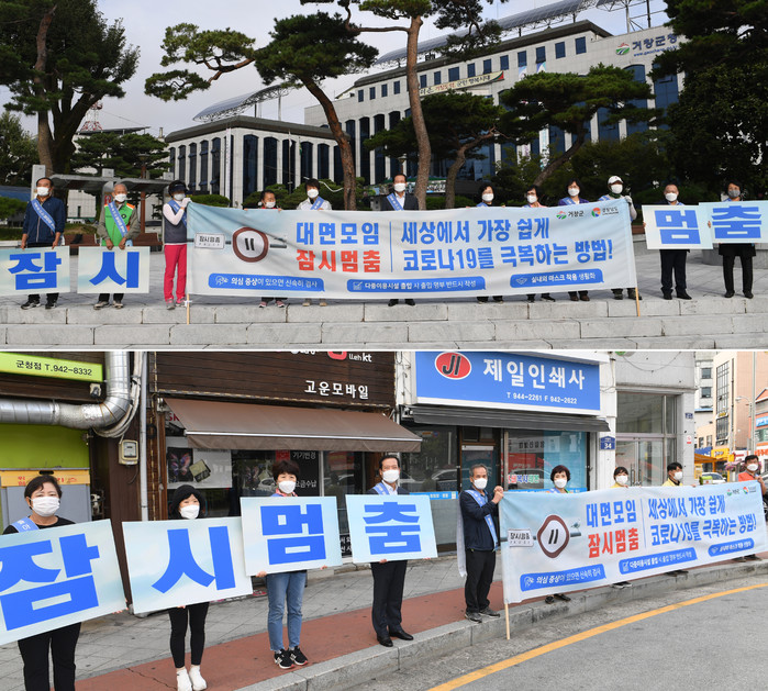 거창군은 9일 코로나19 예방과 확산방지를 위하여 거창군 안전보안관 회원 20여 명이 참석한 가운데 군청 앞 문화휴식광장에서 만남·모임·행사 등 대면 모임 자제를 촉구하는 ‘잠시 멈춤’ 캠페인을 전개했다고 밝혔다.