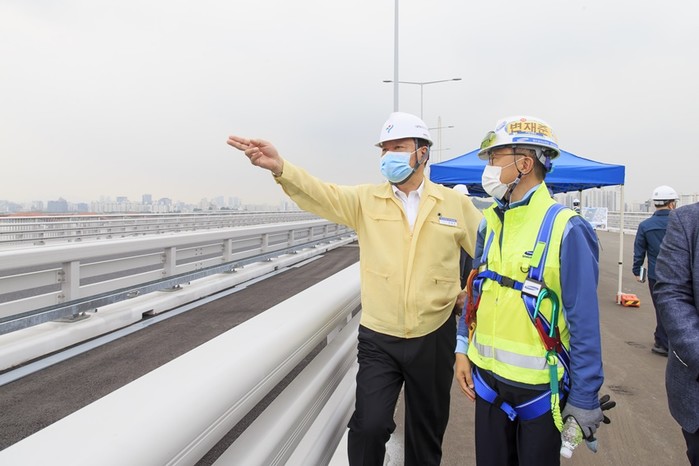 유동균 서울 마포구청장이 11일 오는 9월1일 개통하는 월드컵대교를 현장 점검했다. 사진은 이날 유 구청장(왼쪽)이 월드컵대교 시공 관계자와 현장 점검을 하는 모습. (사진제공=마포구청)