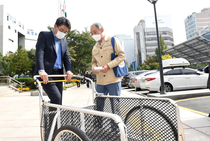 노원구가 최근 구청본관 앞에서 (사)따뜻한 한반도 사랑의 연탄나눔운동과 ‘손수레 전달식’을 열었다. 이날 행사에서는 운동본부에서 폐지·박스 등을 수집해 생계를 이어가는 지역내 저소득층 노인들을 위해 손수레 10개(총 400만원 상당)를 기부했다. 사진은 오승록 구청장(왼쪽)이 손수레 전달식에서 손수레를 살펴보고 있는 모습. (사진제공=노원구청)