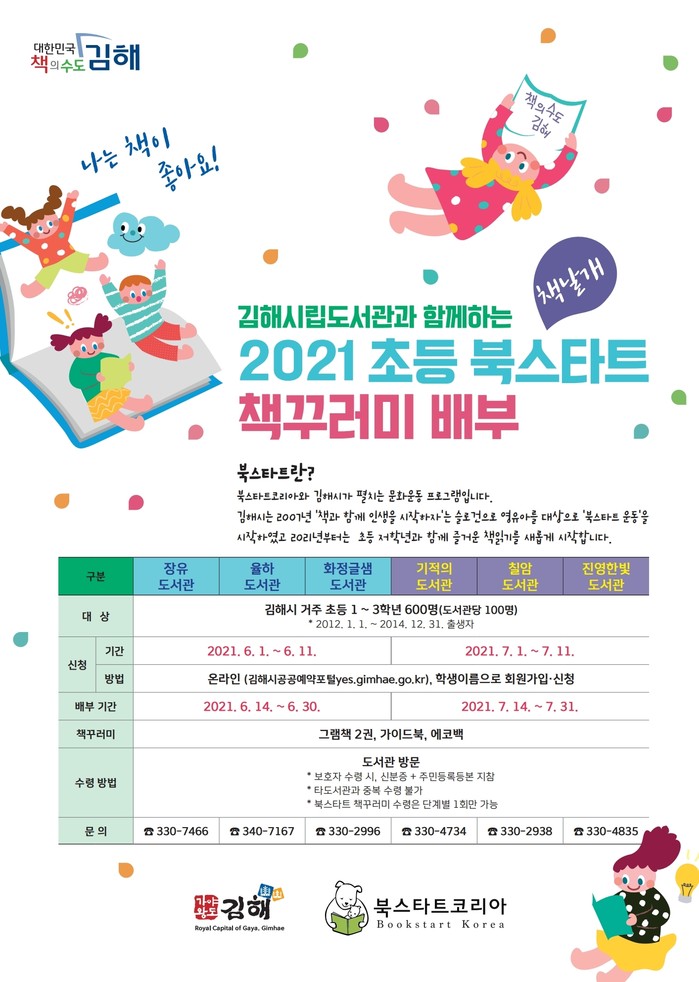 북스타트는 ‘책과 함께 인생을 시작하자’는 슬로건으로 북스타트코리아와 지방자치단체가 함께하는 지역사회 문화운동으로 김해시는 2007년부터 영유아 대상으로 북스타트 운동을 시행하고 있으며 2021년부터는 초등 북스타트까지 확대하여 운영한다. 시립도서관 6개소는 초등 북스타트 ‘책날개’ 꾸러미 배부와 함께 책읽는사회문화재단이 지원하는 북스타트 부모교육도 하반기에 진행하여 부모와 아이가 책으로 소통하기 위한 방법을 전달할 예정이다. 또한 장유도서관에서는 7월 책꾸러미에 들어있는 그림책의 작가와 어린이들이 함께하는 강연도 운영한다.