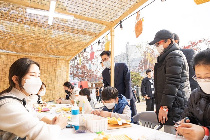 강동구는 최근 양일간 '2020 강동구 전통시장 한마당! ‘장날 愛’행사'를 열었다. 행사에는 구내 모든 전통시장이 참여해 각 시장 대표물품인 청과류·떡·장류 등을 팔았고 전통시장내 청년점포와 다문화상인도 참여했다. 사진은 이정훈 구청장(가운데)이 행사장을 둘러보고 있는 모습. (사진제공=강동구청)