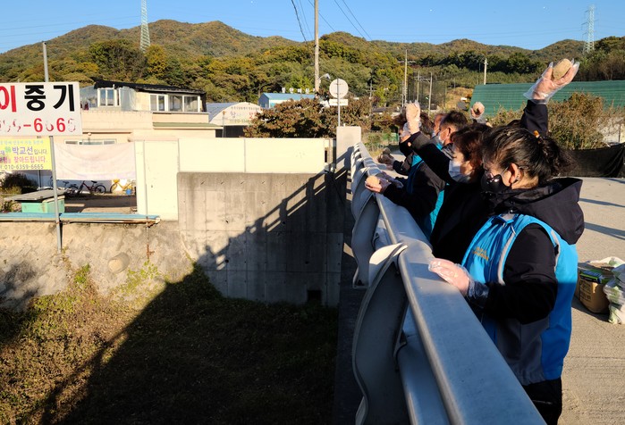 경기 남양주시 별내면 주민자치위원회가 27일 '하천 살리기 생명 살림 운동'의 일환으로 용암천·청학천 등의 수질 향상을 위해 EM 흙공 던지기 행사를 개최했다. 사진은 지역내 소하천에 위원회 회원들이 EM 흙공을 던지고 있는 모습. (사진제공=남양주시청)
