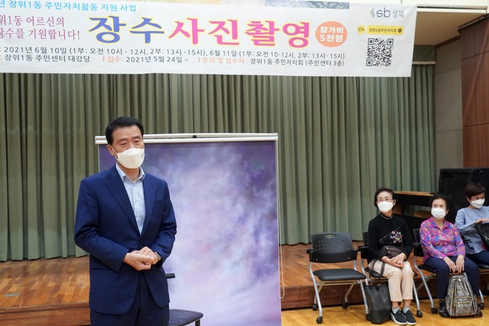 서울 성북구 장위1동 주민센터가 10~11일 코로나19 백신 접종을 마친 75세 이상 노인 100여명을 대상으로 장수사진 촬영 행사를 진행했다. 사진은 10일 장수사진 촬영 현장을 방문한 이승로 구청장(왼쪽)이 노인들과 대화를 하고 있는 모습. (사진제공=성북구청)