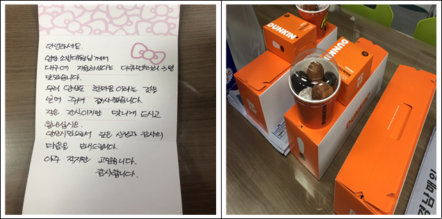 직원들은 배달원으로부터 이름과 주소 없이 전달된 봉투를 되돌려 보내지 못하고 개봉하니 상자에는 도넛과 함께 손편지가 들어있었다.
