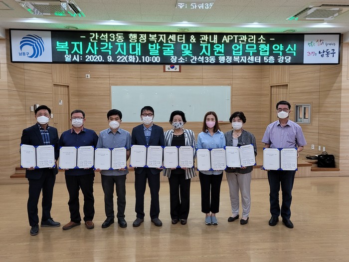 인천 남동구 간석3동행정복지센터는 지난 22일 지역내 아파트 관리소 6곳과 ‘복지사각지대 발굴 및 지원을 위한 업무협약’을 체결했다. 이날 협약을 통해 민·관이 지역내 복지사각지대를 발굴·지원하며, 다양한 사회적 안전망 구축 등에 기여할 예정이다. 사진은 협약식에서 관계자들이 기념촬영을 하고 있는 모습. (사진제공=인천 남동구청)