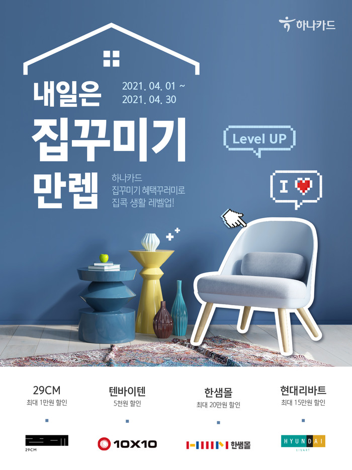 [시민일보 = 여영준 기자] 하나카드는 고객의 합리적인 홈인테리어 관련 소비를 돕기 위해 ‘내일은 집 꾸미기 만렙’ 이벤트를 진행한다고 31일 밝혔다.