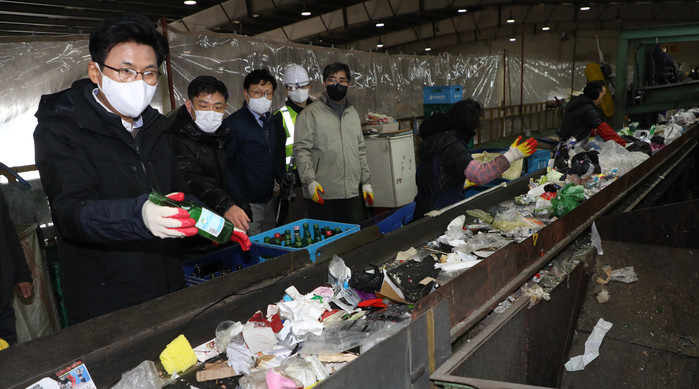 박성수 서울 송파구청장이 16일 송파자원순환공원에서 시설을 점검하고 있다. 송파자원순환공원에는 일회용품 활용을 위한 생활 폐기물 압축시설과 재활용 대형폐기물 처리시설 등이 있다. 1일 재활용품 약 120톤, 대형생활폐기물 약 55톤을 처리하고 있다.