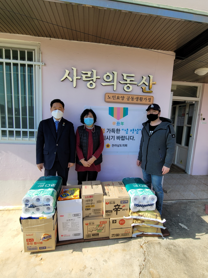 전남도의회 경제관광문화위원회 강문성 의원(더불어민주당, 여수2)은 지난 25일 설을 맞아 지역 노인요양원을 미리 방문해 시설에 필요한 물품을 전달했다.