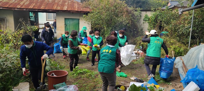 경기 이천시 대월면 새마을지도자협의회가 최근 지역내 취약가구를 찾아 마당 제초작업 및 집 내·외부 불필요한 물건 정리 등을 실시하는 주거환경개선 봉사활동을 펼쳤다. 사진은 이날 봉사자들이 제초작업 및 집안 정리를 하고 있는 모습. (사진제공=이천시청)