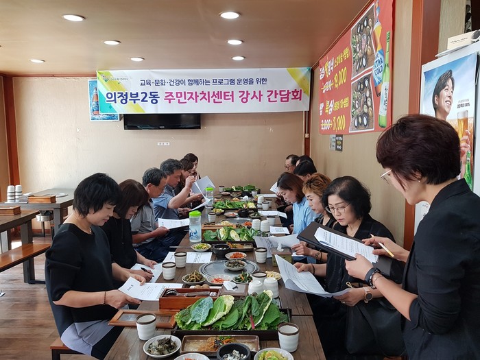 경기 의정부시 의정부2동 주민센터는 16일 주민자치위원장 및 프로그램 강사, 공무원 등 17명이 참석한 가운데 주민자치센터 활성화 방안 모색을 위한 ‘2019년 주민자치센터 강사간담회’를 개최했다. 사진은 간담회 참여자들이 회의하는 모습. (사진제공=의정부시청)