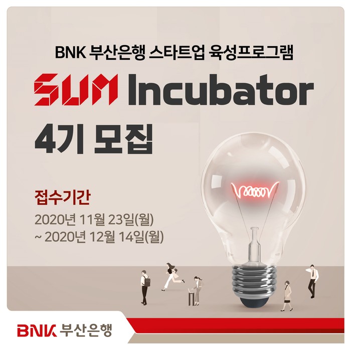 [시민일보 = 여영준 기자] BNK부산은행은 지역 스타트업 육성 프로그램인 ‘썸 인큐베이터(SUM Incubator)’ 4기를 모집한다고 24일 밝혔다.