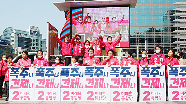 미래통합당 유승민 의원(윗줄 오른쪽 부터), 서울 종로 황교안, 동작을 나경원, 광진을 오세훈 후보, 박형준 공동선대위원장과 서울지역 국회의원 후보들이 휴일인 12일 서울 종로구 청계광장에서 열린 ‘4.15총선 대국민 호소 유세’에서 지지를 호소하고 있다.