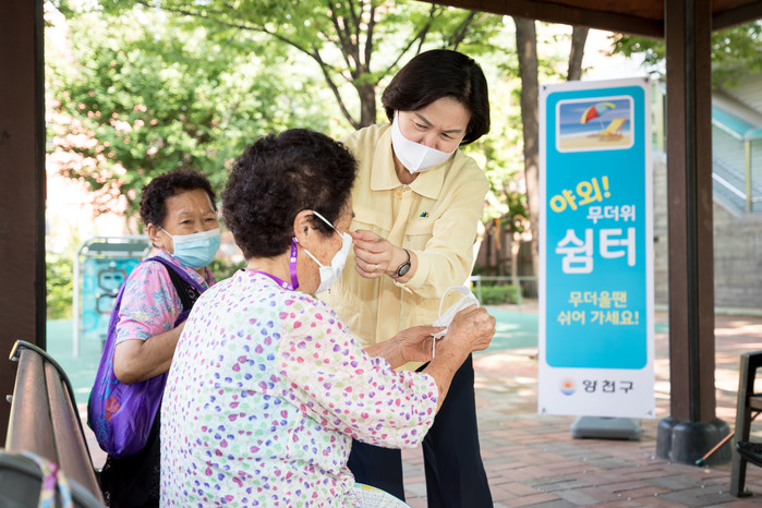서울 양천구는 지역내 취약계층에 전달하기 위해 마스크가 바뀌거나 분실되는 상황을 예방하는 마스크 목걸이를 제작했다. 사진은 김수영 구청장이 지난 18일 서울지역에 폭염경보가 발효된 가운데 노인들에게 구에서 제작한 마스크 분실 방지 목걸이를 걸어주고 있는 모습. (사진제공=양천구청)