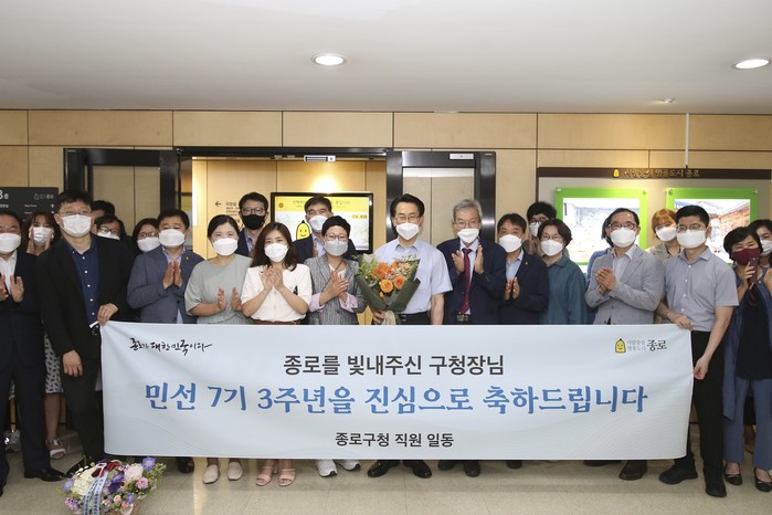 김영종 서울 종로구청장이 1일 ‘민선7기 3주년 기념식’에 참석했다. 이날 행사에서는 민선7기 3주년을 맞아 민선5기부터 지난 11년간의 구정 성과를 살펴보고 종로가 추구하는 가치를 구민·직원들과 공유했다. 사진은 김영종 구청장(가운데)이 직원들과 기념촬영을 하고 있는 모습. (사진제공=종로구청)
