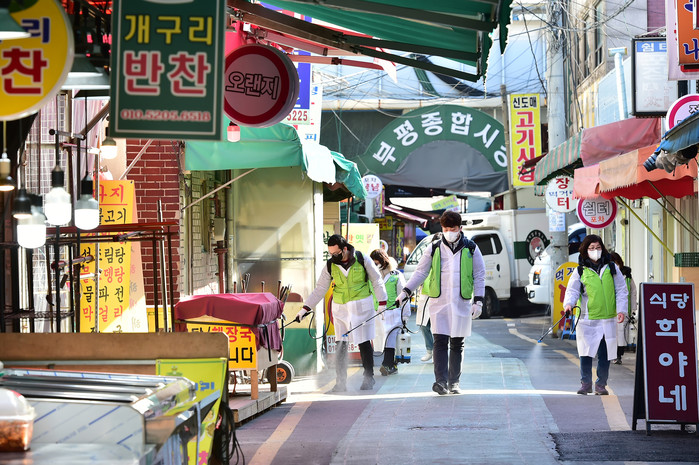 인천 부평구는 23일 지역내 코로나19(우한폐렴) 확진자의 이동 경로가 파악됨에 따라 이동 경로에 포함된 부평역, 확진자 자택, 부평시장 등에 대해 1차 방역을 실시하고 부평시장을 일시 휴장하기로 했다. 사진은 부평시장에서 소독작업을 하는 모습. (사진제공=부평구청)