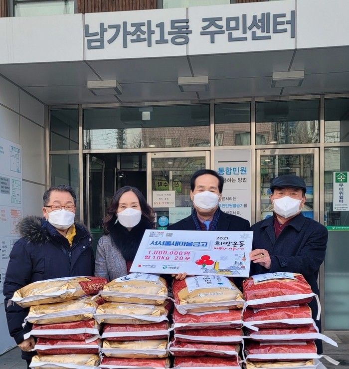 서울 서대문구 남가좌1동이 최근 지역내 소재한 서서울새마을금고로부터 어려운 이웃들을 위한 '2021 희망 온돌 따뜻한 겨울나기' 성금 100만원과 백미 20포(10kg)를 전달 받았다. 이번 성금품은 새마을금고의 대표적 사회공헌활동인 '사랑의 좀도리 운동'을 통해 마련됐다. 사진은 관계자들이 기념촬영을 하고 있는 모습. (사진제공=서대문구청)