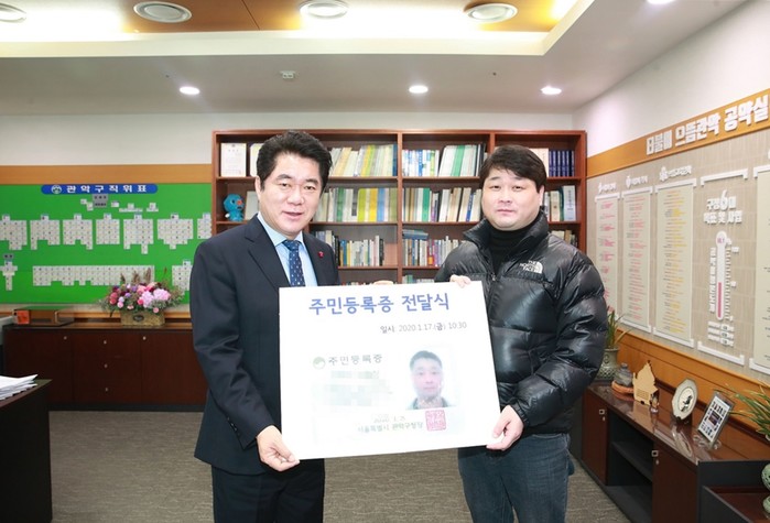 서울 관악구는 최근 신림동 고시원 화재 사고 당시 이재민 현황 파악과 지원 과정에서 발굴된 무호적자 복지사각지대 주민에게 주민등록증을 전달했다. 사진은 박준희 구청장(왼쪽)이 주민에게 주민등록증을 전달한 후 함께 기념촬영을 하는 모습. (사진제공=관악구청)