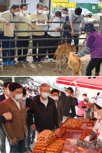 더불어민주당 이낙연 대표가 김순호 구례군수, 김영록 전남지사와 함께 지난 19일 오후 전남 구례군 구례읍 양정마을 내 한 축산농가를 방문, 주민들과 대화하고 있다(위). 국민의힘 김종인 비상대책위원장이 지난 18일 오전 서울 중구 남대문시장을 찾아 상인들과 대화하고 있다.