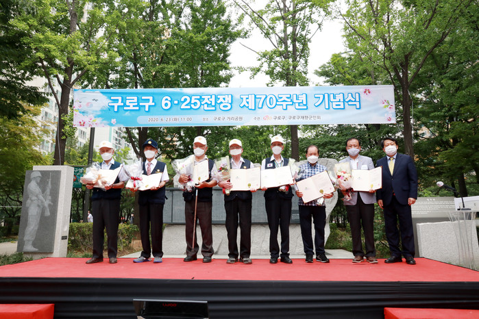 구로구가 6.25전쟁 70주년을 맞아 23일 거리공원(구로동 50) 참전유공자 기념비 앞에서 기념행사를 개최했다. 사진은 이성 구청장(오른쪽)과 이날 행사에서 구청장 표창을 받은 모범 국가유공자들이 기념촬영을 하는 모습. (사진제공=구로구청)