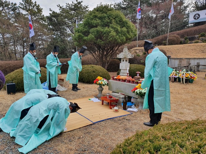충남 홍성군 금마면은 최근 죽림리 철마산 3.1공원 기념비 앞에서 기미독립운동을 펼쳤던 184명의 독립유공자 선열을 추모하는 제향을 개최해 제를 지내며 선열을 추모하고 그들의 업적을 재조명했다. 사진은 이날 유족회·독립유공자 유가족들이 참석해 제를 지내고 있는 모습.(사진제공=홍성군청)