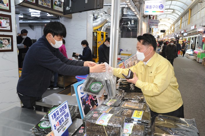 장덕천 경기 부천시장이 10일 부천자유시장에 방문해 우한폐렴(신종 코로나바이러스 감염증) 확산으로 인해 어려움을 겪고 있는 소상공인들을 위해 물품을 구매하며 시장 이용 활성화를 유도했다. 사진은 장 시장(오른쪽)이 물품을 구매하는 모습. (사진제공=부천시청)
