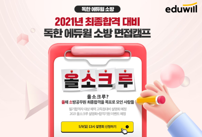 [시민일보 = 여영준 기자] 종합교육기업 에듀윌(대표 박명규) 본사가 운영하는 ‘독한 에듀윌 소방 노량진학원’이 소방면접 설명회 ‘올소크루(올해 소방공무원 최종 합격을 목표로 모인 사람들)’를 오는 9일 오후 1시에 개최한다.