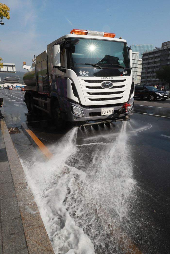 수도권 전역에 고농도 미세먼지 '예비저감조치'가 시행된 21일 오전 광화문역 인근에서 물청소차량이 운행되고 있다.
