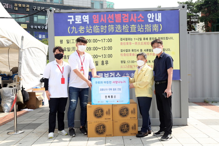 구로구에 코로나19 확진자 급증으로 고생하는 의료진과 종사자들을 응원하기 위한 음료, 과일 등의 성품 기부가 이어지고 있다. 사진은 ‘만복통신’으로부터 비타민음료 22박스를 기증받고 기념촬영을 하고 있는 관계자들의 모습. (사진제공=구로구청)