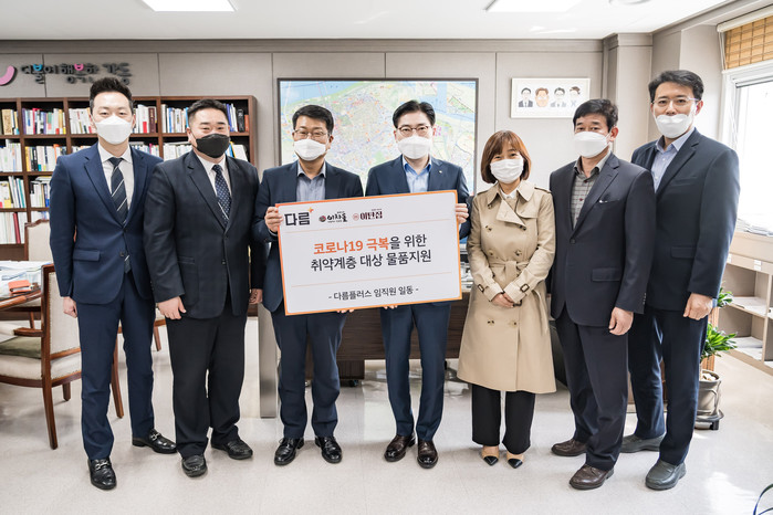 이정훈 서울 강동구청장이 최근 구청장 집무실에서 (주)다름플러스로부터 '코로나19로 어려움을 겪는 취약계층 이웃들에게 전해달라'며 진공 포장된 도가니탕 2000팩을 기부했다. 사진은 지원물품을 전달받고 다름플러스 관계자들과 기념촬영을 하고 있는 이 구청장(가운데)의 모습.(사진제공=강동구청)