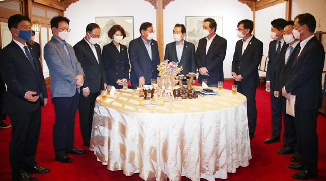 정세균 국무총리, 더불어민주당 이낙연 대표, 김태년 원내대표, 김상조 청와대 정책실장, 홍남기 경제부총리 등이 6일 서울 삼청동 총리공관에서 열린 고위 당정협의회에서 대화하고 있다. 왼쪽부터 민주당 김영배 의원, 박광온 사무총장, 홍남기, 민주당 한정애 정책위의장, 김태년, 정세균, 이낙연, 김상조, 민주당 오영훈 당대표 비서실장, 최인호 당대변인, 유동수 정책위수석부의장.