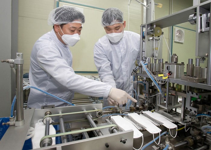 | ▲ 대전에 위치한 마스크 제조기업 '레스텍'에서 박나원 공장장(오른쪽)과 삼성전자 스마트공장지원센터 권오창 멘토(왼쪽)가 마스크 본체와 귀끈 연결 상태를 점검하고 있다.(사진제공=삼성전자) |