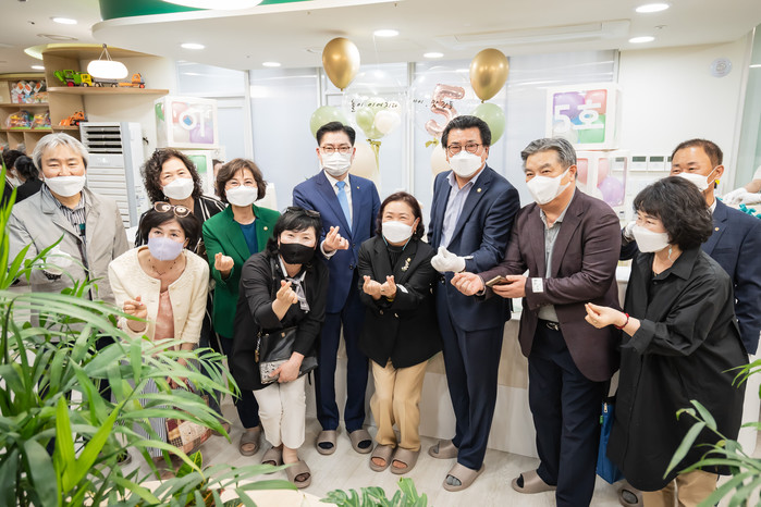 서울 강동구가 22일 아이·맘 강동 5호 암사점(고덕로27길 7)을 개소했다. 5호점은 128.3㎡ 규모로 장난감, 도서, 육아용품을 대여하는 장난감도서관을 운영한다. 사진은 개소식에서 이정훈 구청장이 관계자들과 기념촬영을 하는 모습. (사진제공=강동구청)