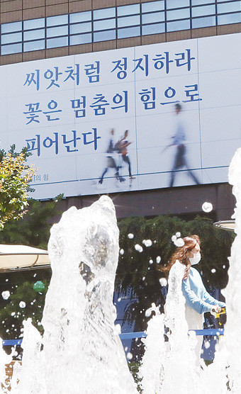 1일 오전 서울 교보생명 광화문 글판 여름편에 백무산 시인의 ‘정지의 힘’ 시 구절 “씨앗처럼 정지하라/꽃은 멈춤의 힘으로/피어난다”가 담겨 있다.